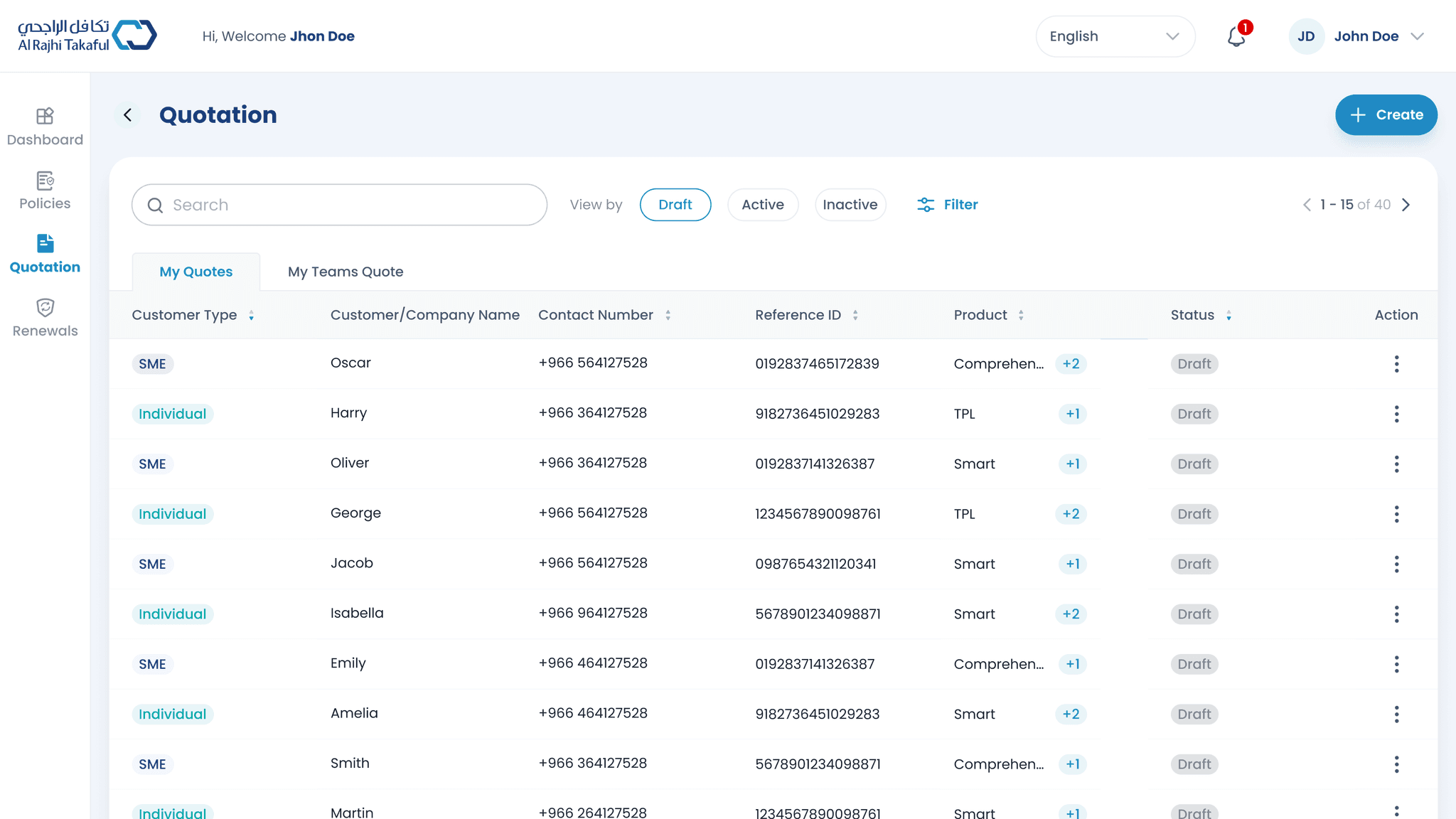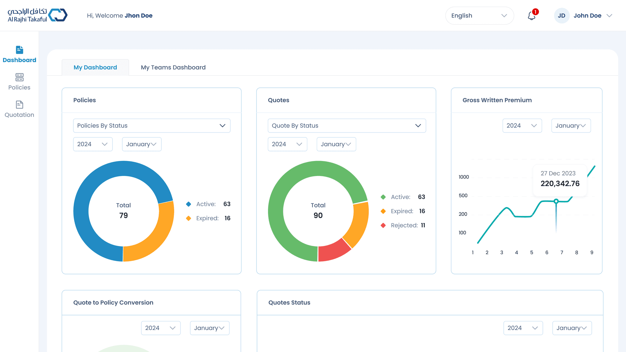Unified Dashboard: Designed a clean, centralized hub where brokers could view, track, and manage all policies and quotes in one place.