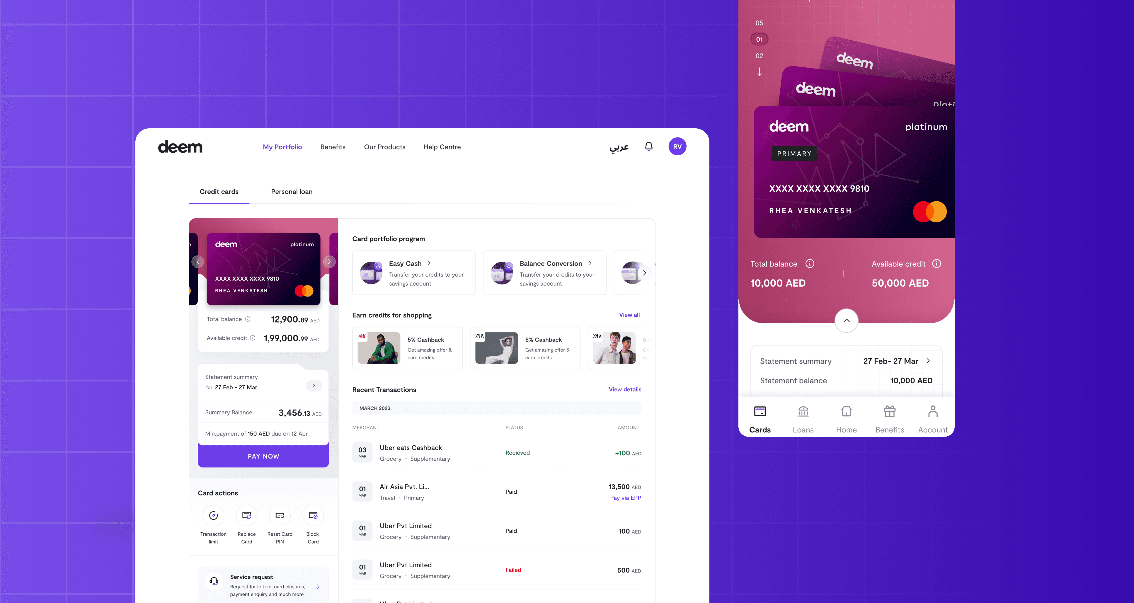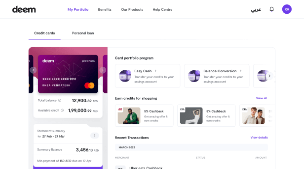 DEEM is a modern FinTech SaaS product tailored for the UAE market that aggregates personal loans, multi-purpose credit cards, utility bill payments, and a dynamic rewards system into one unified platform. It was designed to compete with the best-in-class products like Careem Pay, Mashreq Neo, Liv, PhonePe, and Paytm — but with a cleaner, faster, and more intuitive experience. The goal was to build a best-in-class user experience that not only met regional compliance standards but also delighted users with every interaction.